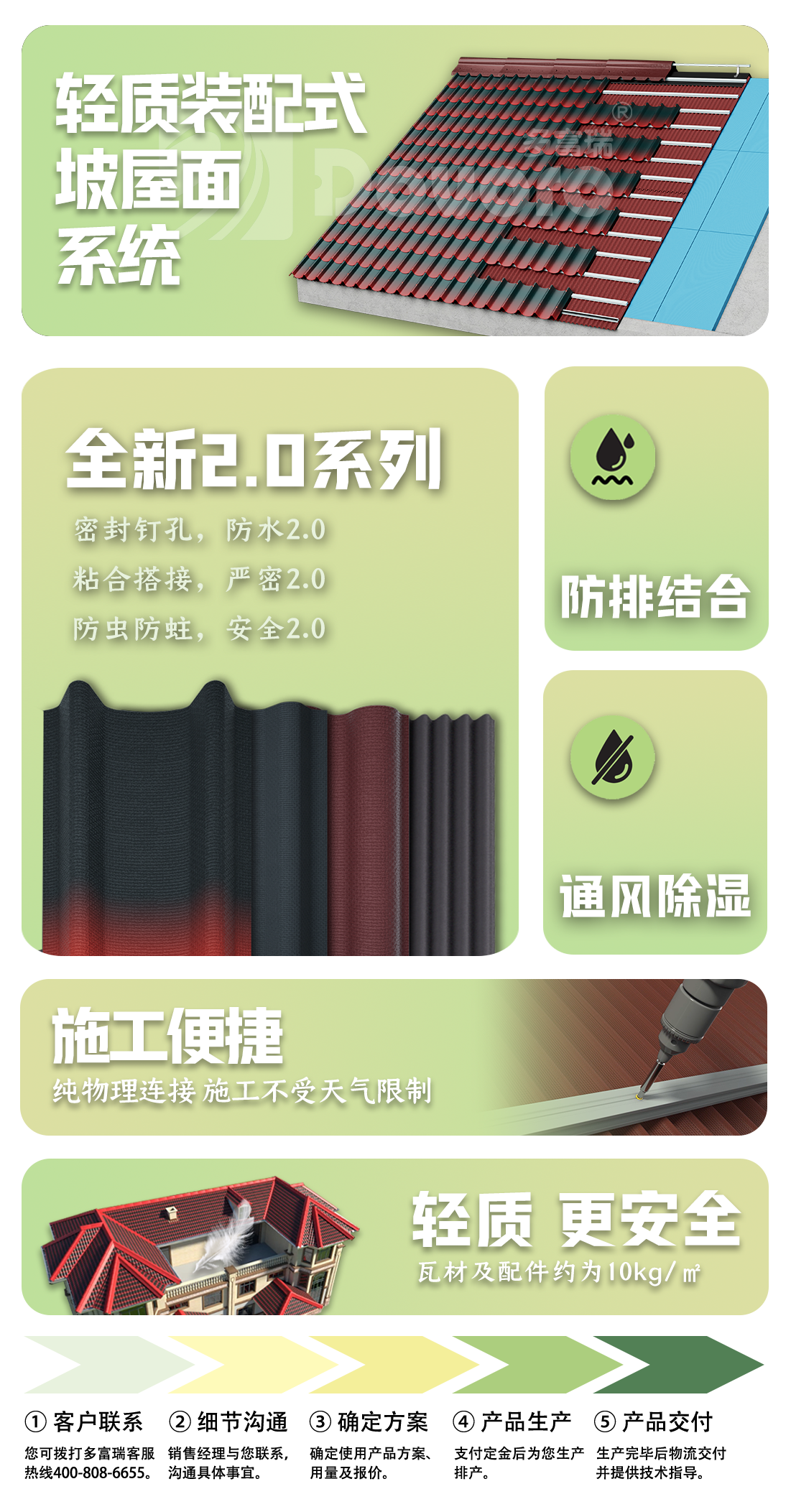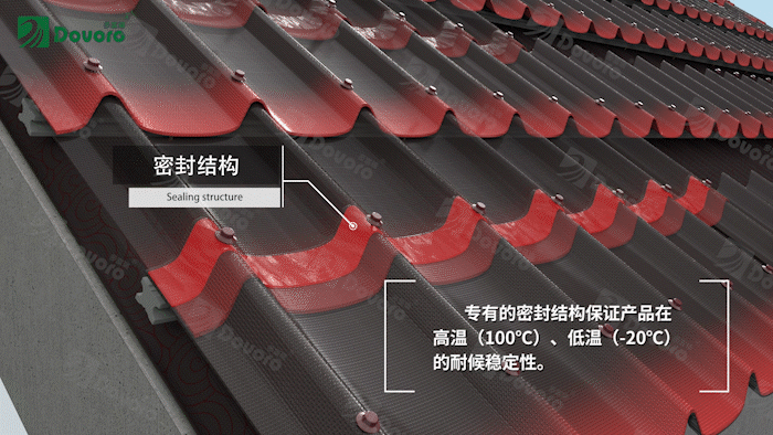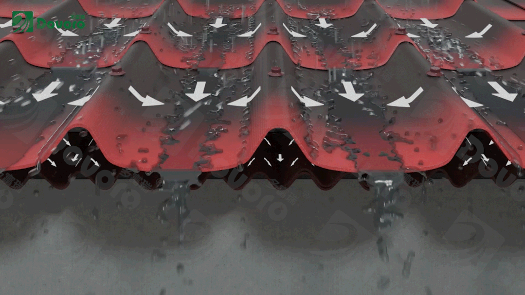 多富瑞轻质坡屋面系统采用防排结合的设计。雨水打在屋面瓦上,波形结构有利于雨水从波峰流至波谷,再从上而下将雨水排出。