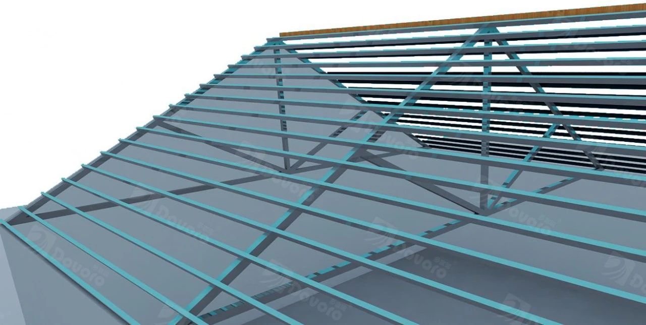 搭建钢结构坡屋面骨架,施工前首先检查基层的平整度及强度,保证钉子锚固强度。