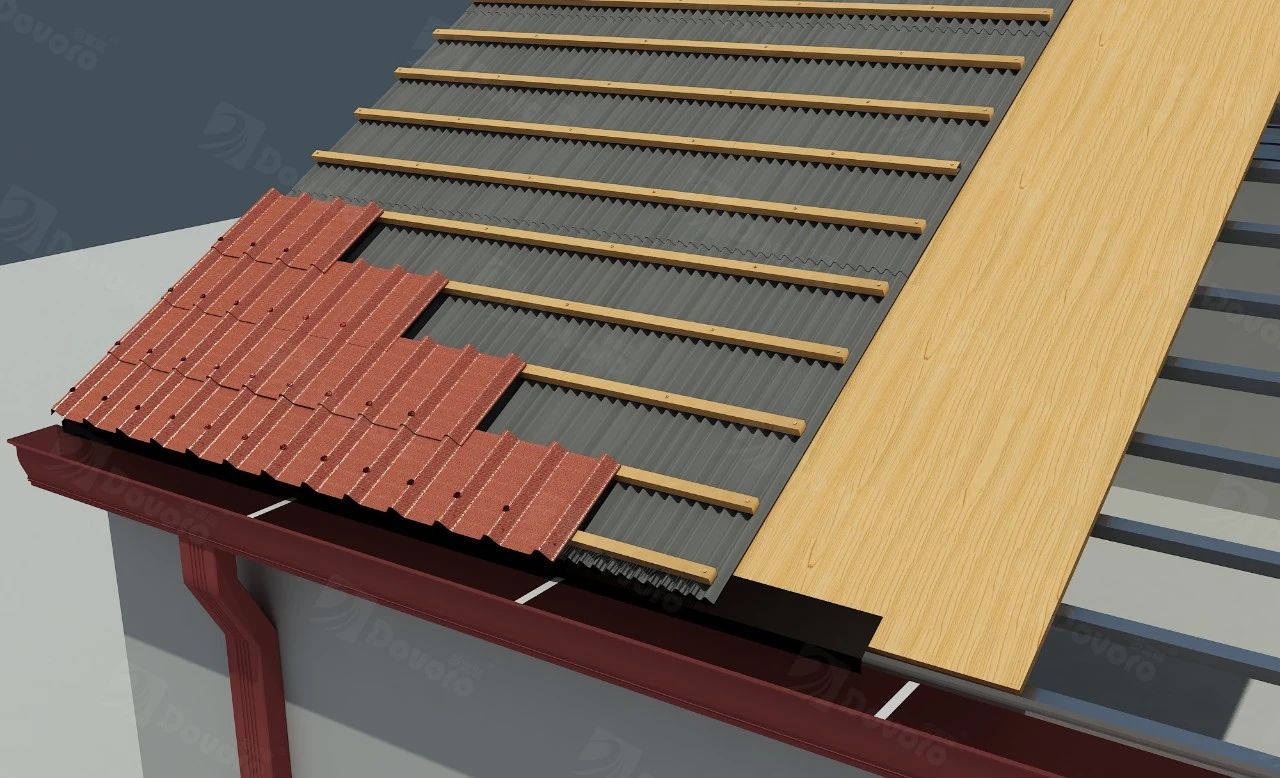 在檩条上铺设木望板或其他屋面板,再依次铺设波形沥青防水板与波形沥青瓦。即使在高强度的降雨下,下层的波形沥青板仍可将屋面雨水排出。