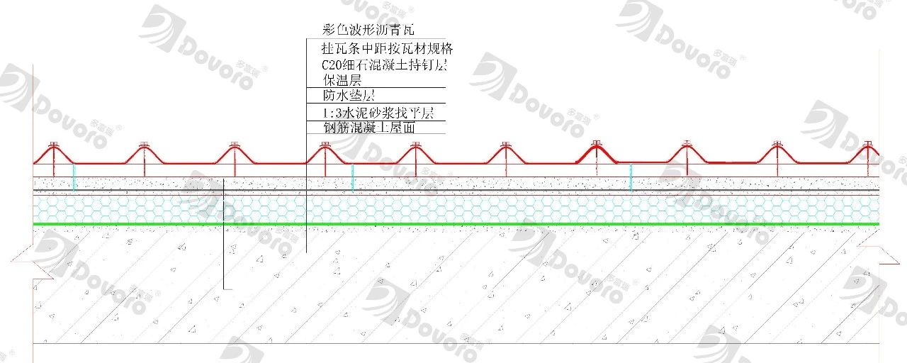 在项目的屋面改造设计中,屋面构造由下而上依次为水泥基层、找平层、防水卷材、保温层、持钉层、挂瓦条、幻彩波形沥青瓦。波形沥青瓦每平仅约3kg的重量,减轻老旧住宅屋面承重负担;屋面构造间采用物理连接,大大提升施工效率,减少施工周期,降低屋面改造对居民生活的影响。