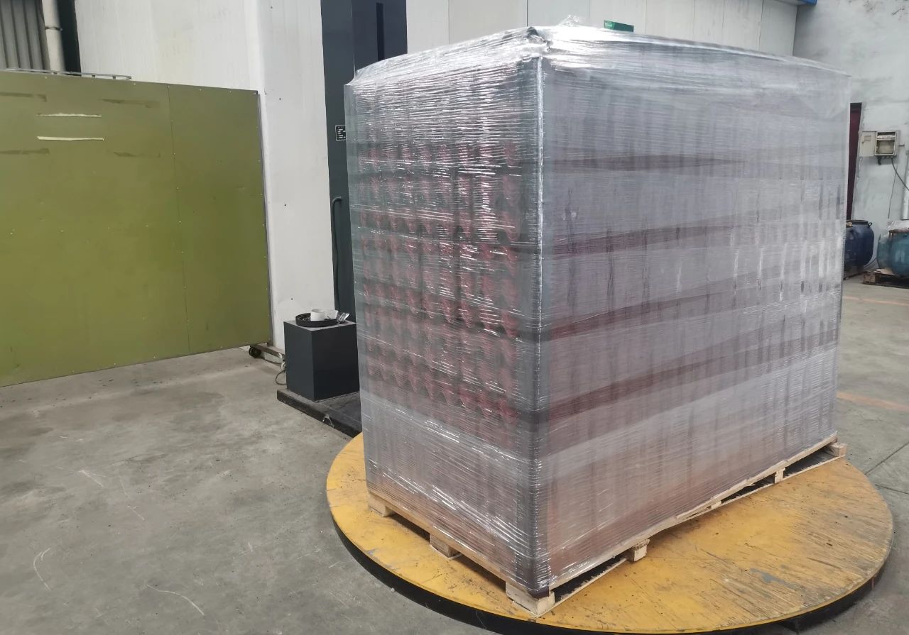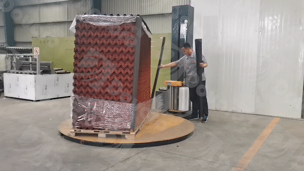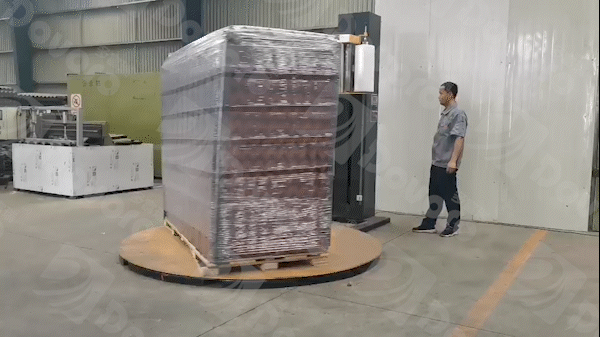 进行完以上流程后,货物在包装机上完成包装的最后步骤。使用具有韧性的包装膜,对货物的整体进行缠绕,固定住四个角落的护边和上方的盖帽。不仅使货物更整体更稳固,也将货物密封在包装之中,与周围不确定环境隔离。