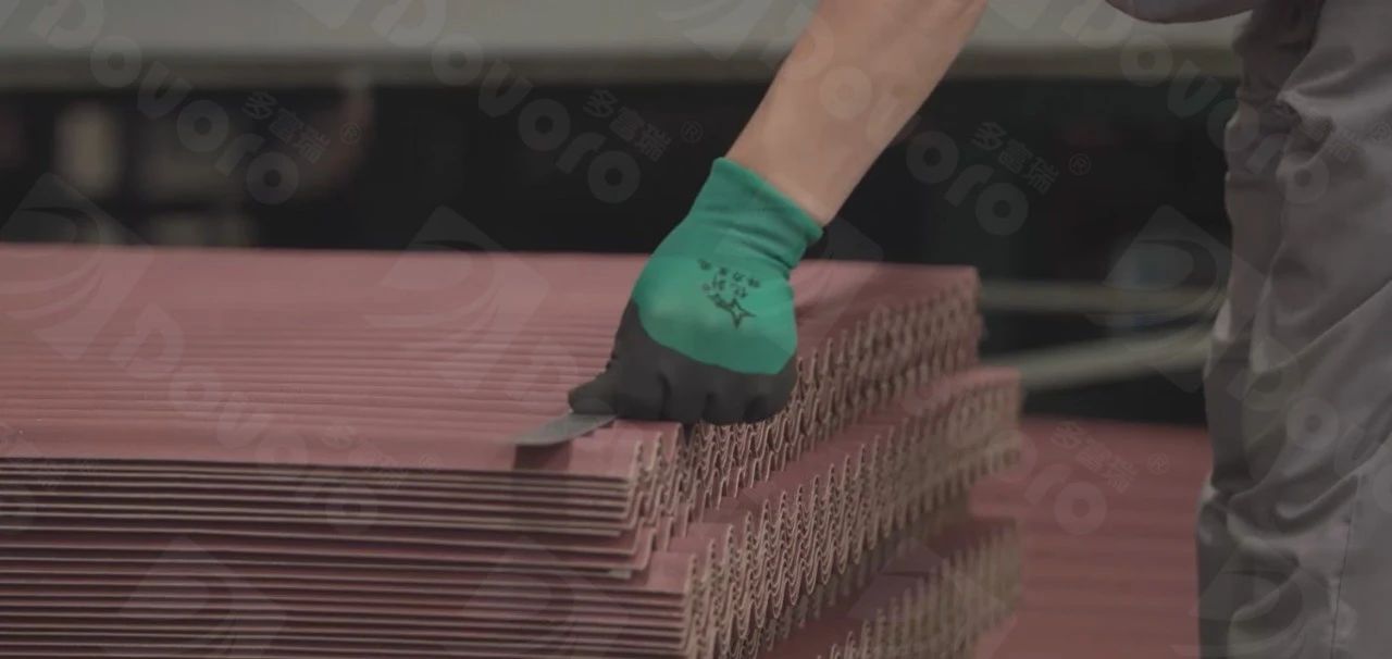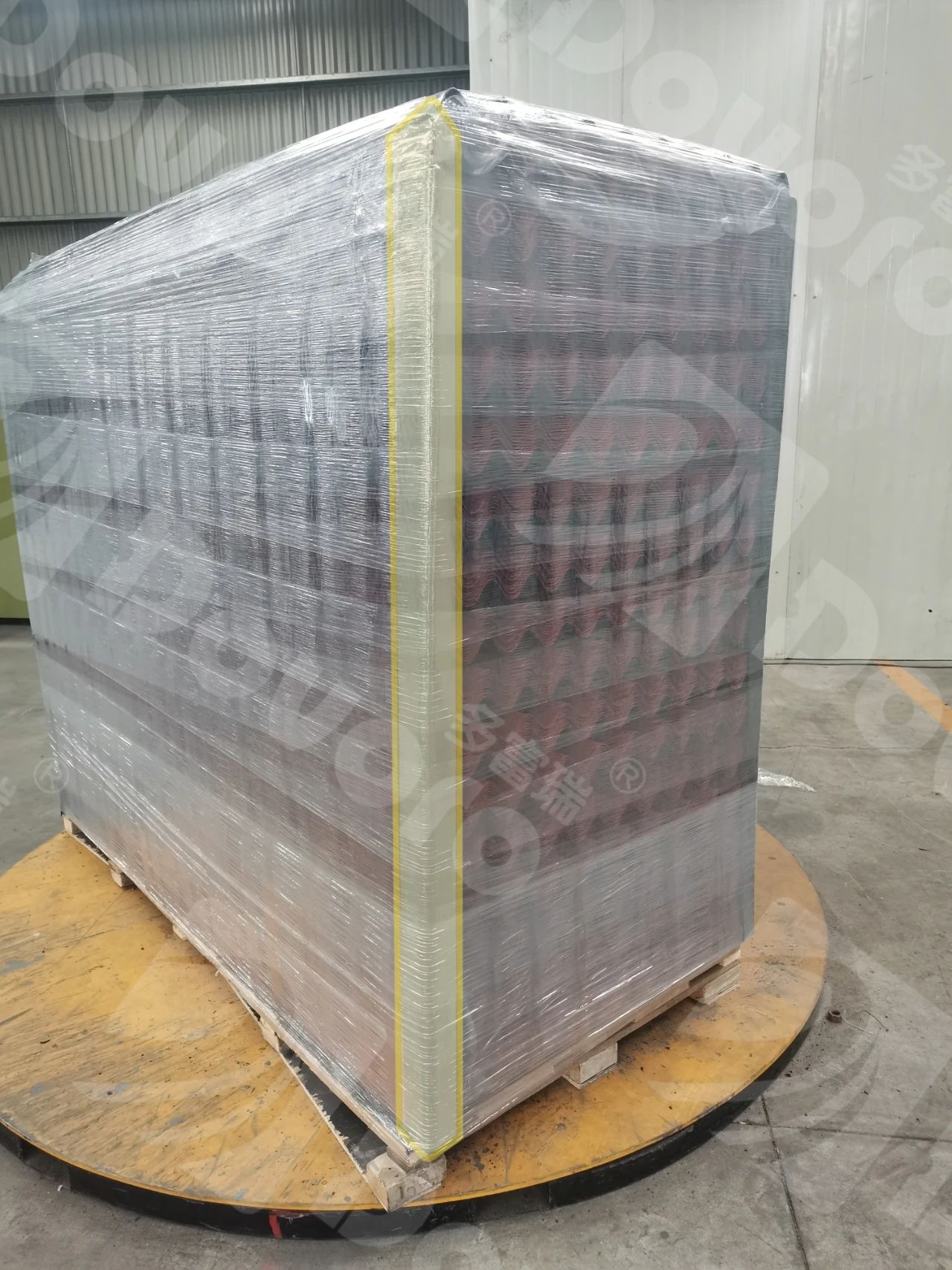 为了便于发货前的检查和到货后的客户验收,多富瑞采取错位码垛的方式,错位部分的投影面积在下方木板面积之内,波形沥青防水板均采用6张一错位的方式码垛,彩色波形沥青瓦均采用10张一错位的方式码垛。